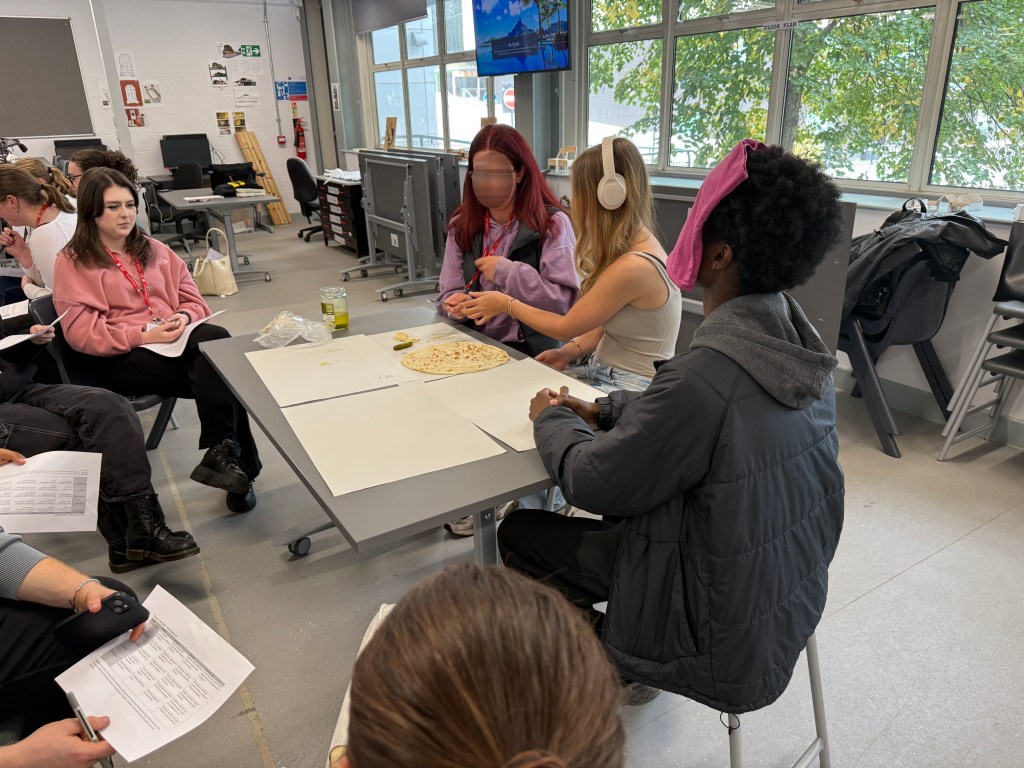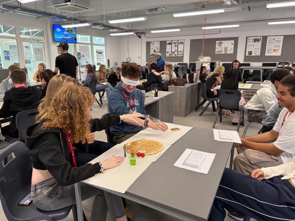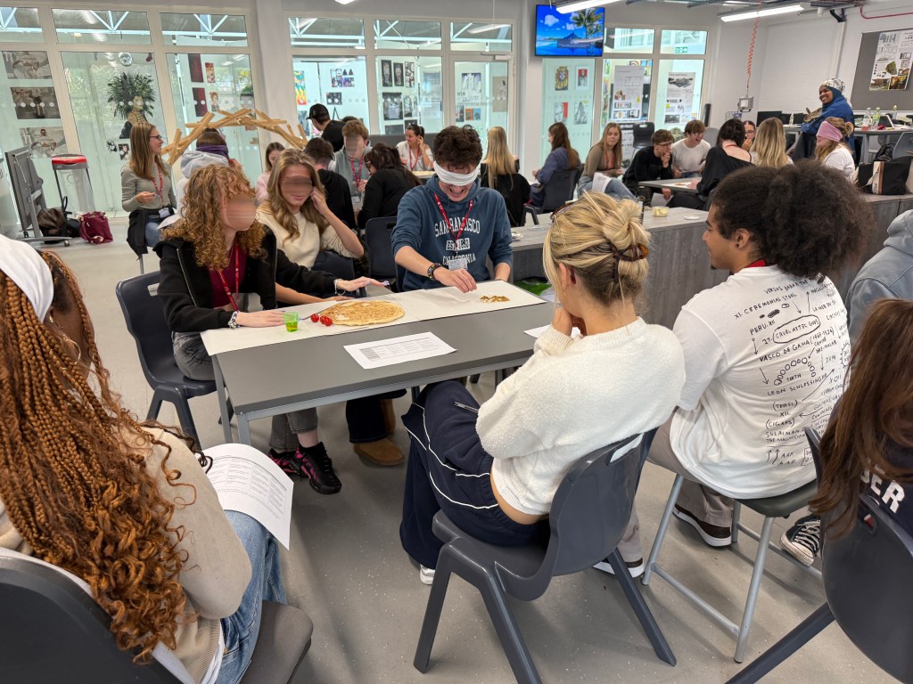 Afterwards, each examiner wrote their individual marks, compared them with peers in their group, and reached an agreement on final scores for the team building the sandwich. They then shared their evaluations with the whole class, sparking discussion about communication gaps and teamwork strategies that would have made the collaboration more effective.