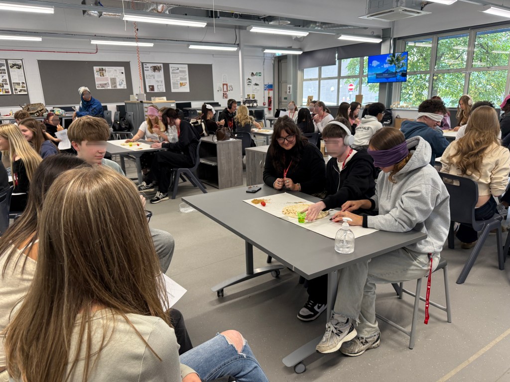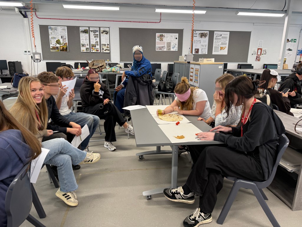 To add a cultural layer, I introduced ingredients that were unfamiliar to many – Middle Eastern, Asian Food. One sandwich used hummus, olive oil, and pickles; the other combined zaatar, olive oil, and tomatoes. Many students knew hummus, but zaatar was entirely new to them (thyme with sumac and sesame seeds). For both sandwiches, naan bread was used, I got it warm and fresh from the bakery. All of these ingredients activated olfactory sense with their strong smells especially the fresh bread and zaatar and pickles. This became not only a sensory experience but also an introduction to different cultures through food.